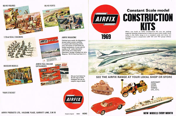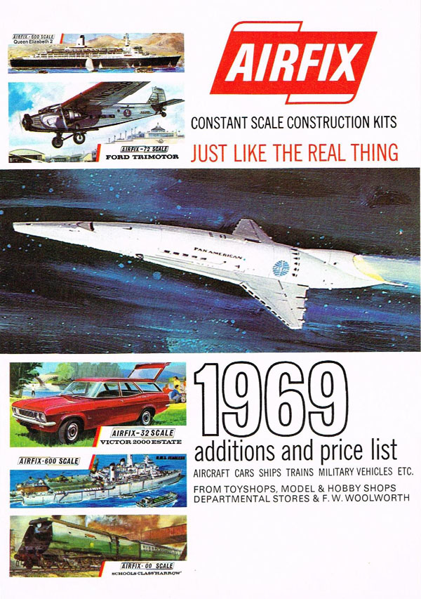 Two colour leaflets were also issued. One was clearly intended as an insert for the catalogue and it is shown as such on the back of the other leaflet. Both have 1969 on the front. The Insert was a 6 page leaflet with full colour cover and insides. It was sub-titled “1969 Additions and Price List”. Kits were available from toy model & hobby shops, departmental stores and F.W. Woolworths! The cover kits, with the exception of the Pan-Am 2001 were all in the catalogue. Inside were photos and boxtops of 21 new models (inc. Pan-Am 2001).  Notable were the 1:32 German Infantry and the first two Waterloo figure sets. It carried the catalogue number of INS.900207.
