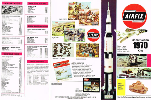 The other leaflet did not carry page numbers and new releases were shown as “available soon” or “summer” or “autumn”. There were three issues. The first came in two versions: “900032 HOME” and “900113 FWW” (with F. W. Woolworths on the front). I have a FWW one with a dealer’s stamp on the back so presumably not all found their way into Woolies! The second issue were all numbered “900032 HOME” and differed in having several “available soon” comments removed and several ‘Elite’ series kits were deleted. The third issue was also numbered “900032 HOME” but had five new kits added.