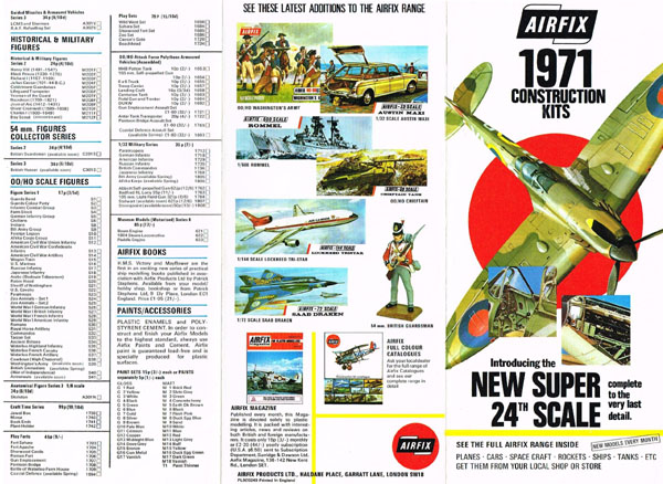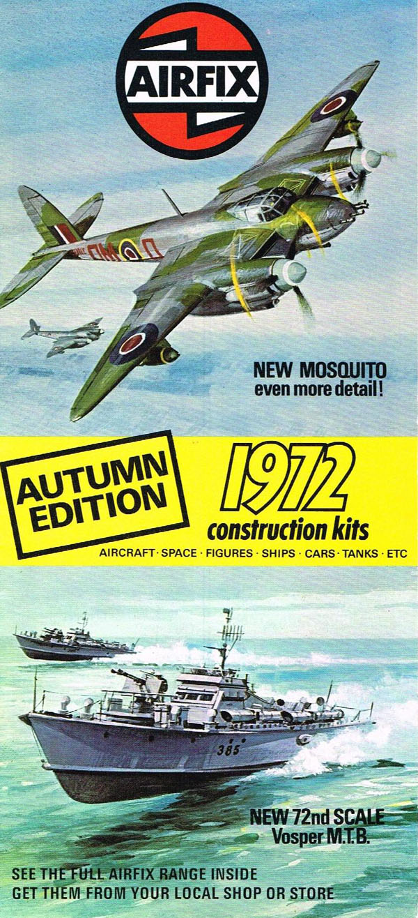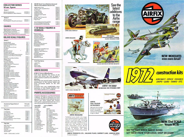 The “Latest Editions” leaflet was an eight page fold-out leaflet, 223 mms by 153 mms in portrait mode. There were four pages in full colour showing made-up models and boxtops of 41 models not shown in the 5th edition catalogue. With so many new kits it is surprising that a new catalogue was not produced, presumably a colour insert was cheaper. I never saw a second issue 5th edition catalogue at the time but picked up several leaflets from counters.
