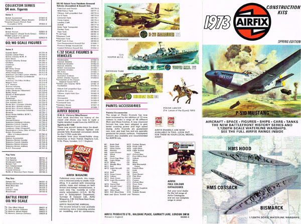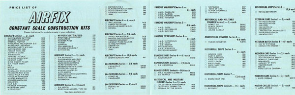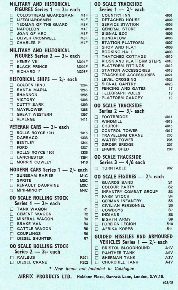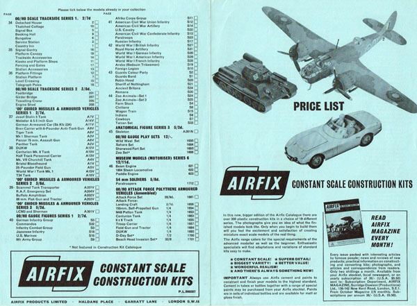 It ran to 32 pages, including covers and measured 211 mms by 140 mms. The covers were in full colour but the insides were in black and white and two shades of blue. The inside back cover has a three quarter page advert for Airfix Magazine which shows the November 1961 magazine. The other quarter has details of Airfix Paints and Cements (see CS32). The inside cover announced that “Airfix Modelling is definitely 5 Star Modelling”. Details of around 135 kits were given. One of the first of the light blue price lists (624/05) appeared on the counters and may have been included in the catalogue because it lists 17 “New items not included in Catalogue”. It was double-sided and measured 202 mms by 127 mms in portrait orientation.