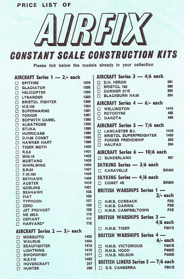 However, whilst writing this article I came across another earlier leaflet which did not have the asterixed kits (Harvard, Anson, Heinkel, etc) and did not mention “* New items not included in Catalogue”. It was being sold with a 1st Edition catalogue so I believe it must be the first of two price lists for the 1st edition.