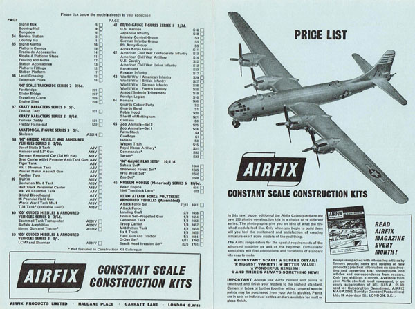 Announced in the December 1968 Airfix Magazine was the 6th edition catalogue which had the same number of pages but was roughly 25% larger than the 5th edition at 239 mms by 205 mms.  The layout was similar to the previous one(s) but the extra space allowed for national insignias and airline markings.
